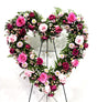 Superbe gerbe sur pied en forme de cœur sur pied aux teintes roses et fuchsia, composé de roses fuchsia et roses, de chrysanthèmes et de wax, le tout sublimé par un écrin de verdure généreuse."